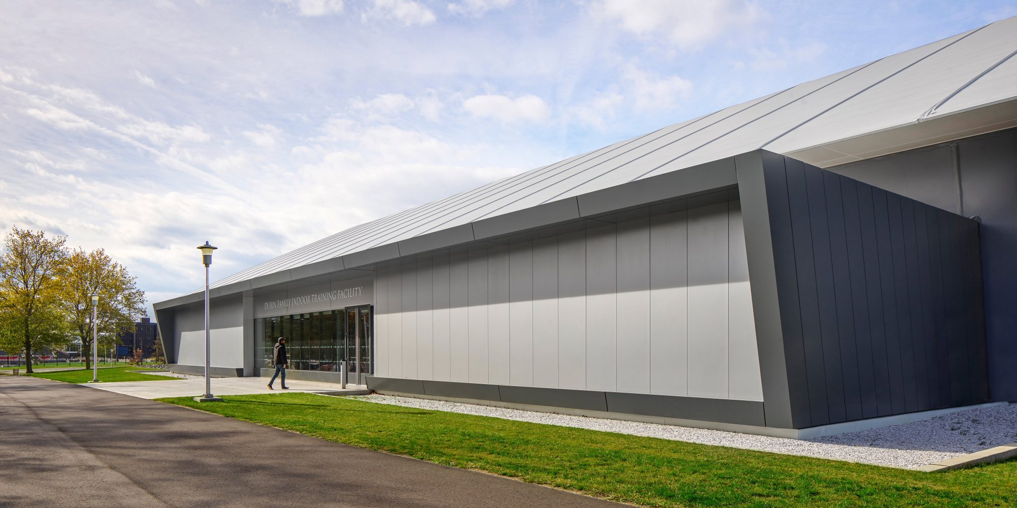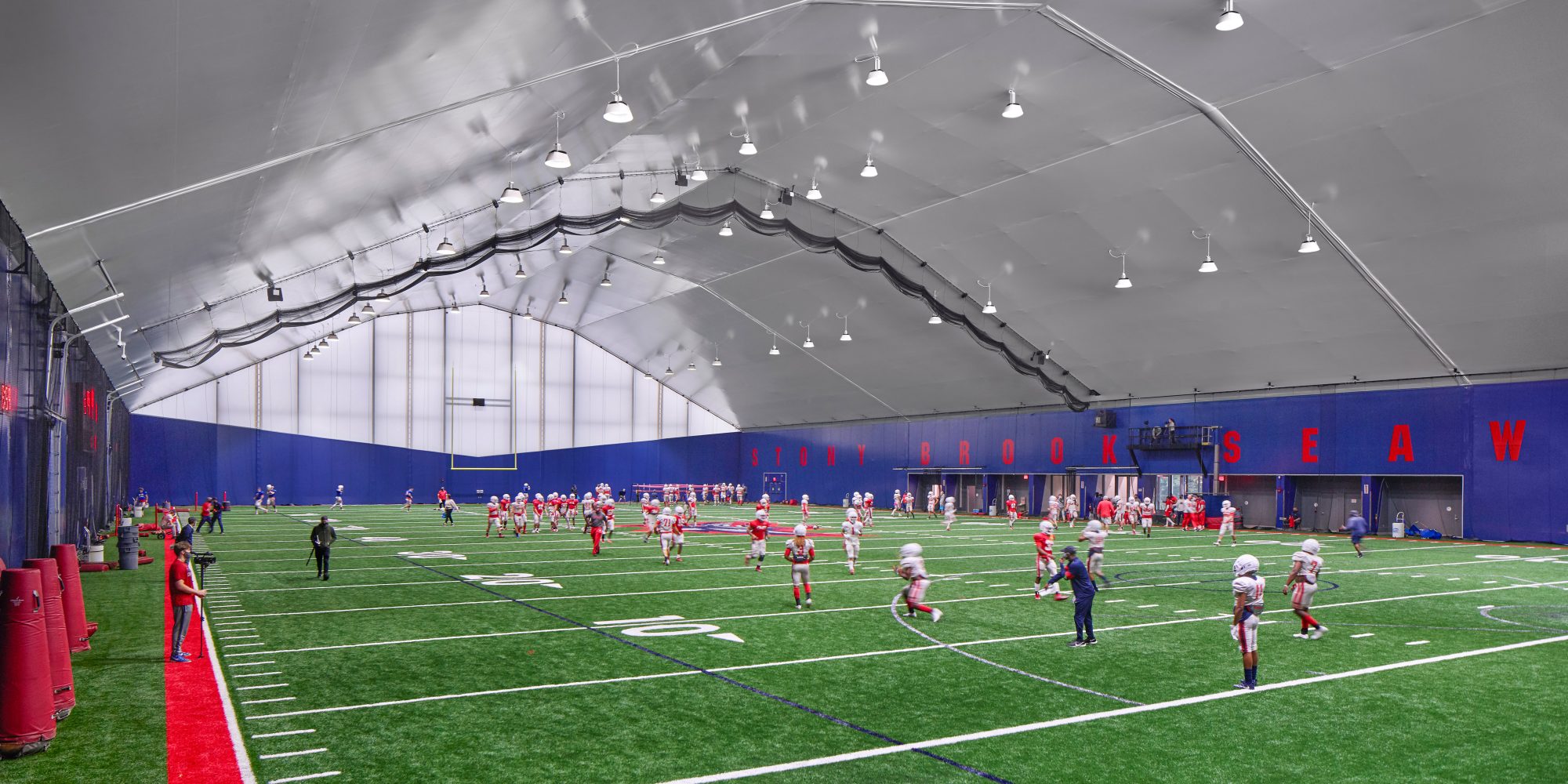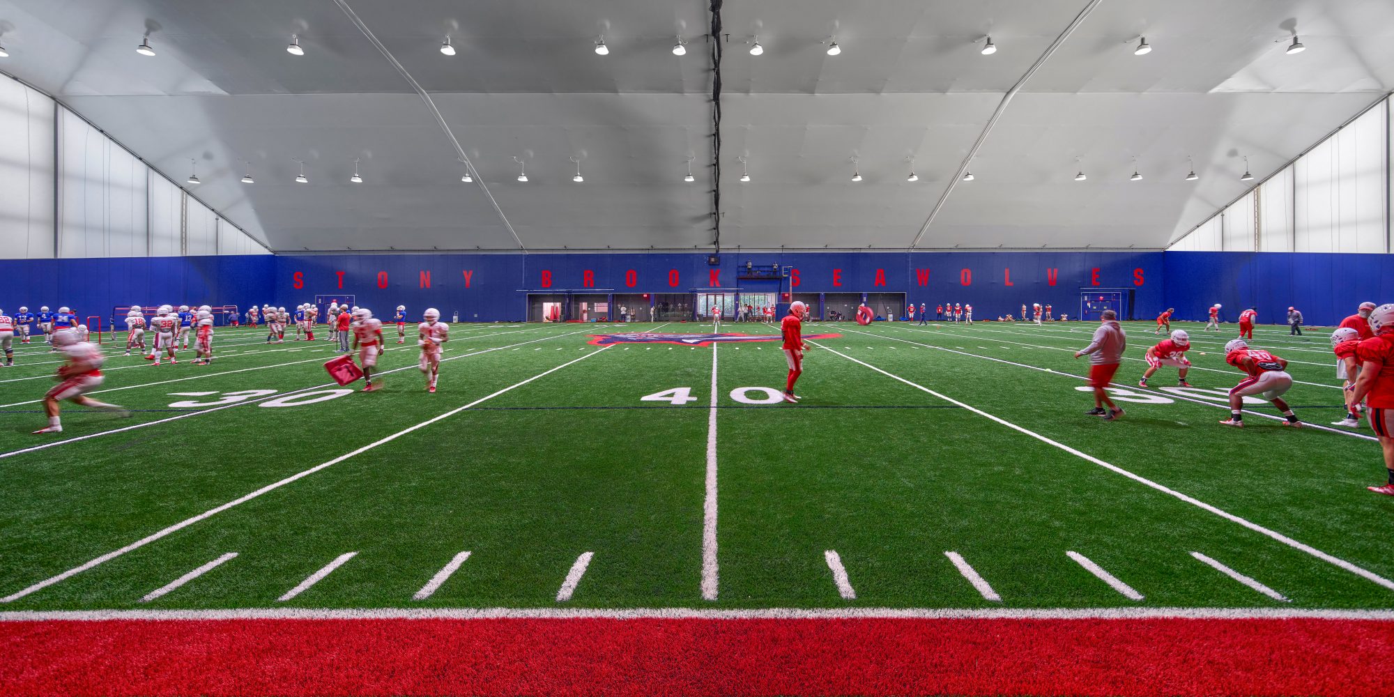 Stony Brook University’s Department of Athletics needed a space for its varsity (NCAA Division 1) field sports teams to train during the winter months and inclement weather. Rafael Viñoly Architects proposed a cost-effective solution consisting of a new 80-yard artificial turf field covered with a pre-fabricated tension fabric structure and a 4,000 sf fieldhouse. Located in a large field adjacent to the Kenneth LaValle Stadium, the curved form of the Dubin Family Indoor Training Facility roof appears to emerge from the surrounding landscape.