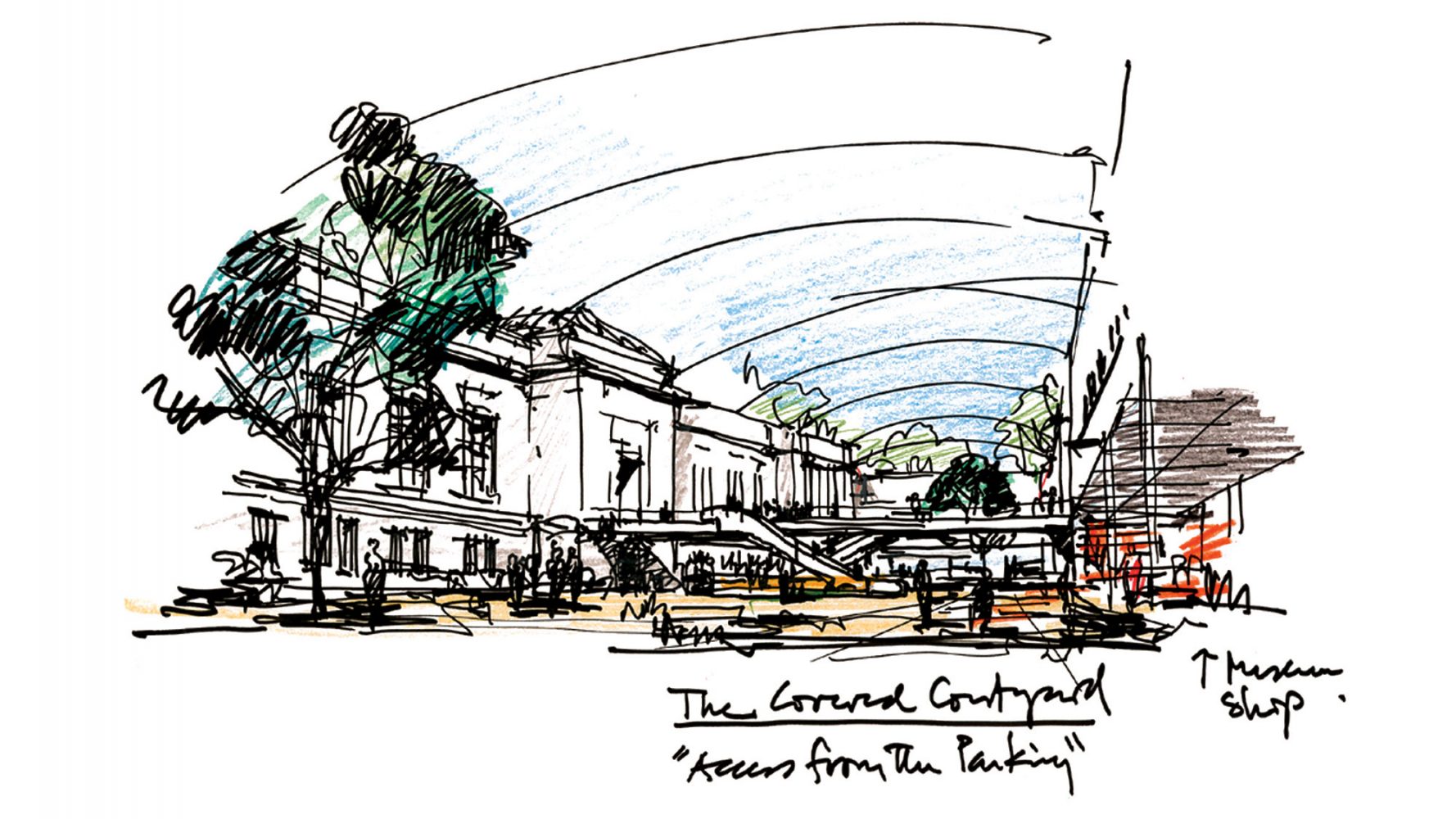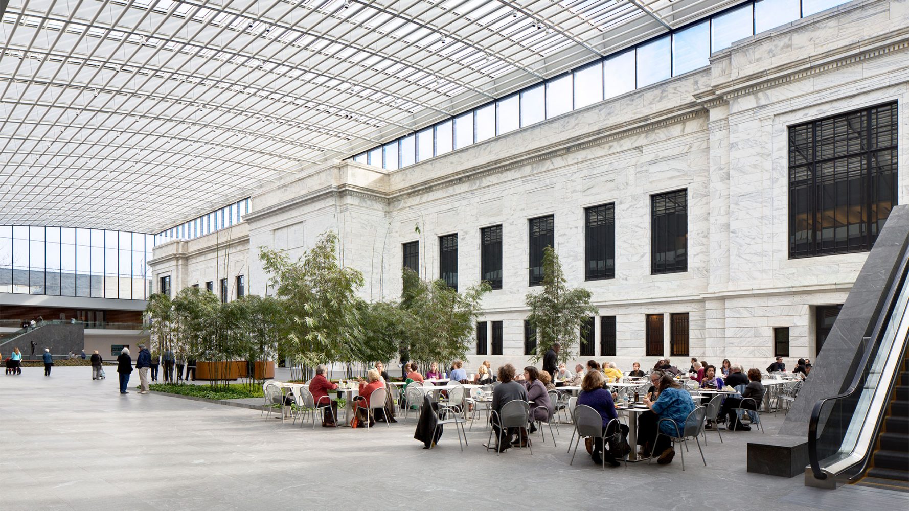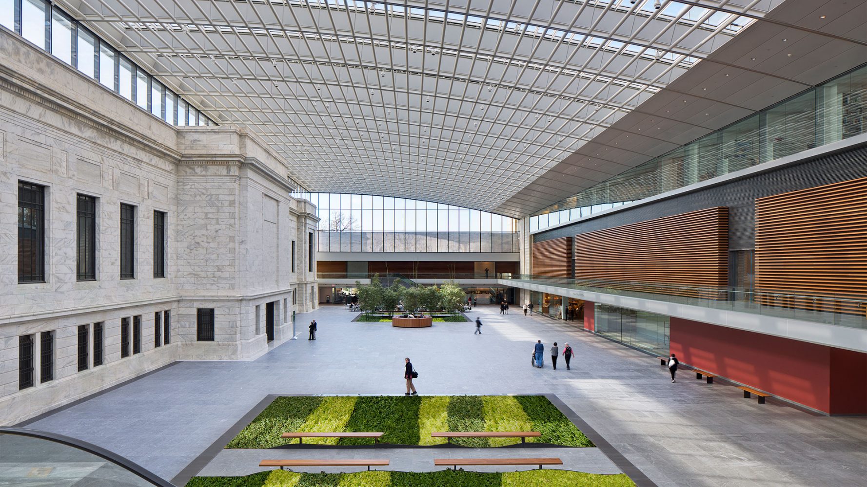 该设计将重点放在原有的1916年建筑,将其视为一个包括翻新Breuer大楼在内的连续扩展空间环上的宝石。其他的加建被拆除,留出一个巨大的室内阳光广场,它由玻璃和钢的曲面屋顶覆盖。室内景观和日光吸引游客到的没有柱子支撑的广场,它是博物馆中心的大型公共空间,为公众聚会和多功能活动提供了场所。它的两侧是一个咖啡馆,餐厅和大型零售店,以为游客服务。