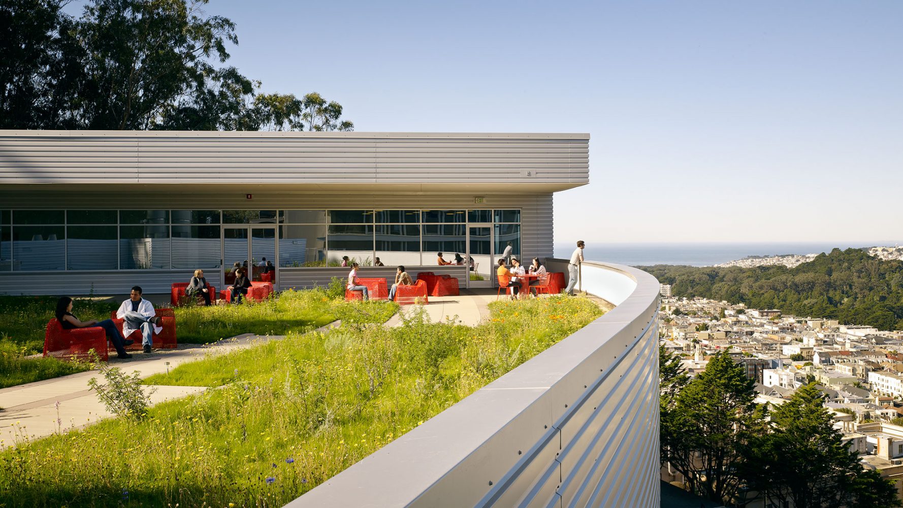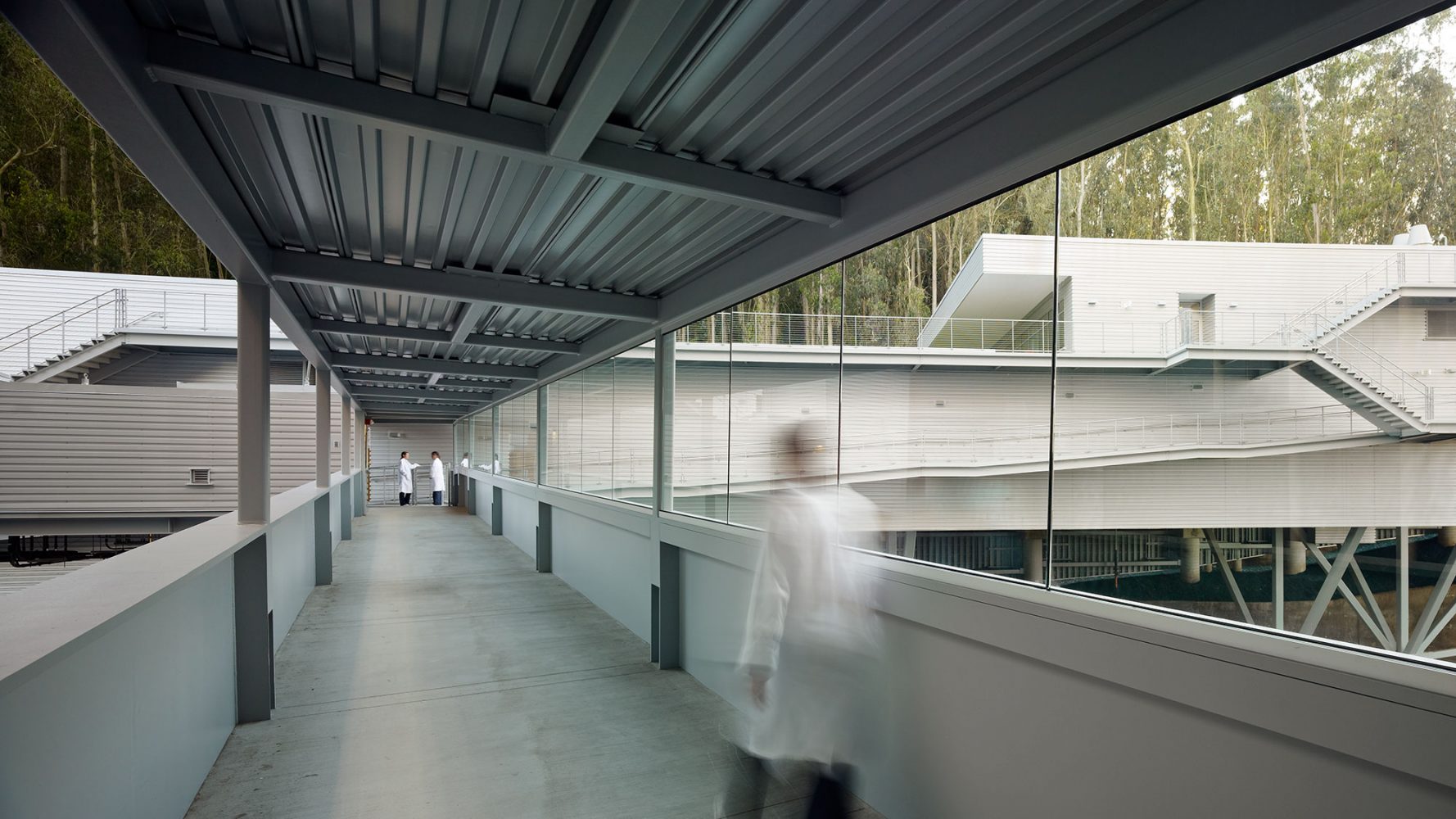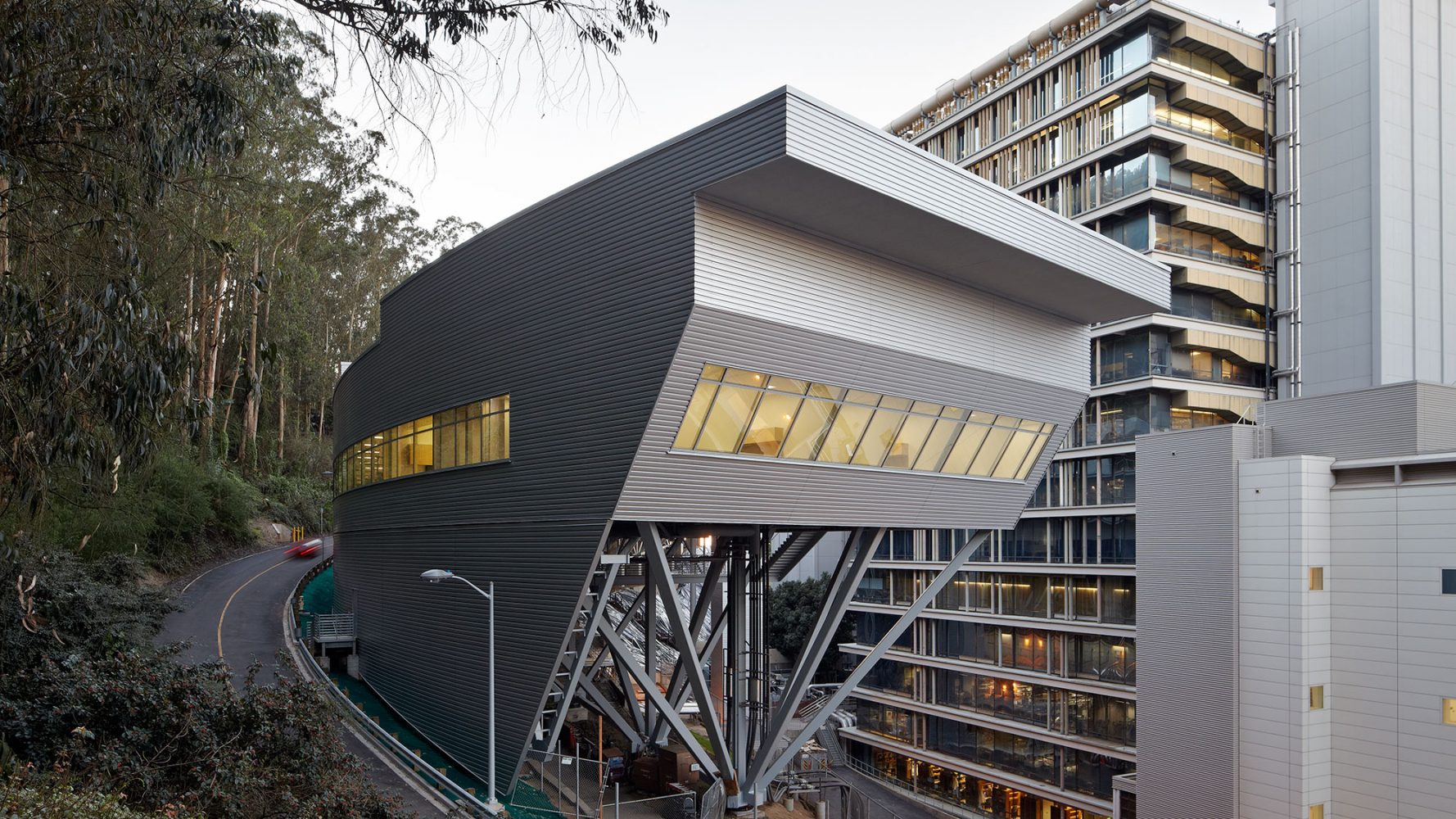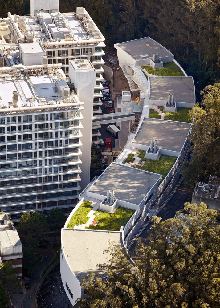 Given that the building was to be located on a steeply sloped site at the foot of Mount Sutro, the client expected a vertically organized structure, which could have led to the creation of a series of small, stacked floor plates that might not have been well-suited to the institute’s research needs. Based on the firm’s experienced precedent that a horizontal scheme is best for interior lab organization and for research collaboration, Rafael Viñoly Architects found a way to plan a horizontal building despite the challenging site. Four split-level floor plates step down a half-story as the building descends the forested mountain slope, allowing the main floor to function as one continuous laboratory. Each half-story step is topped by an office cluster and a green roof. Exterior ramps and stairs take advantage of the temperate climate to provide continuous circulation between all levels. The facility connects to three nearby research and medical buildings–Medical Sciences, Health Sciences West, and Health Sciences East–via a pedestrian bridge. The building structure is supported by space trusses on concrete piers, minimizing site excavation and allowing for the incorporation of seismic base isolation to absorb earthquake forces.