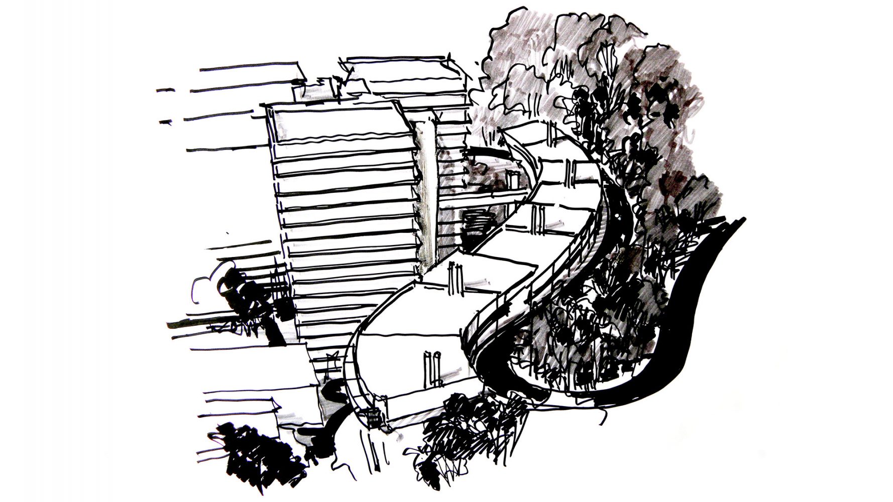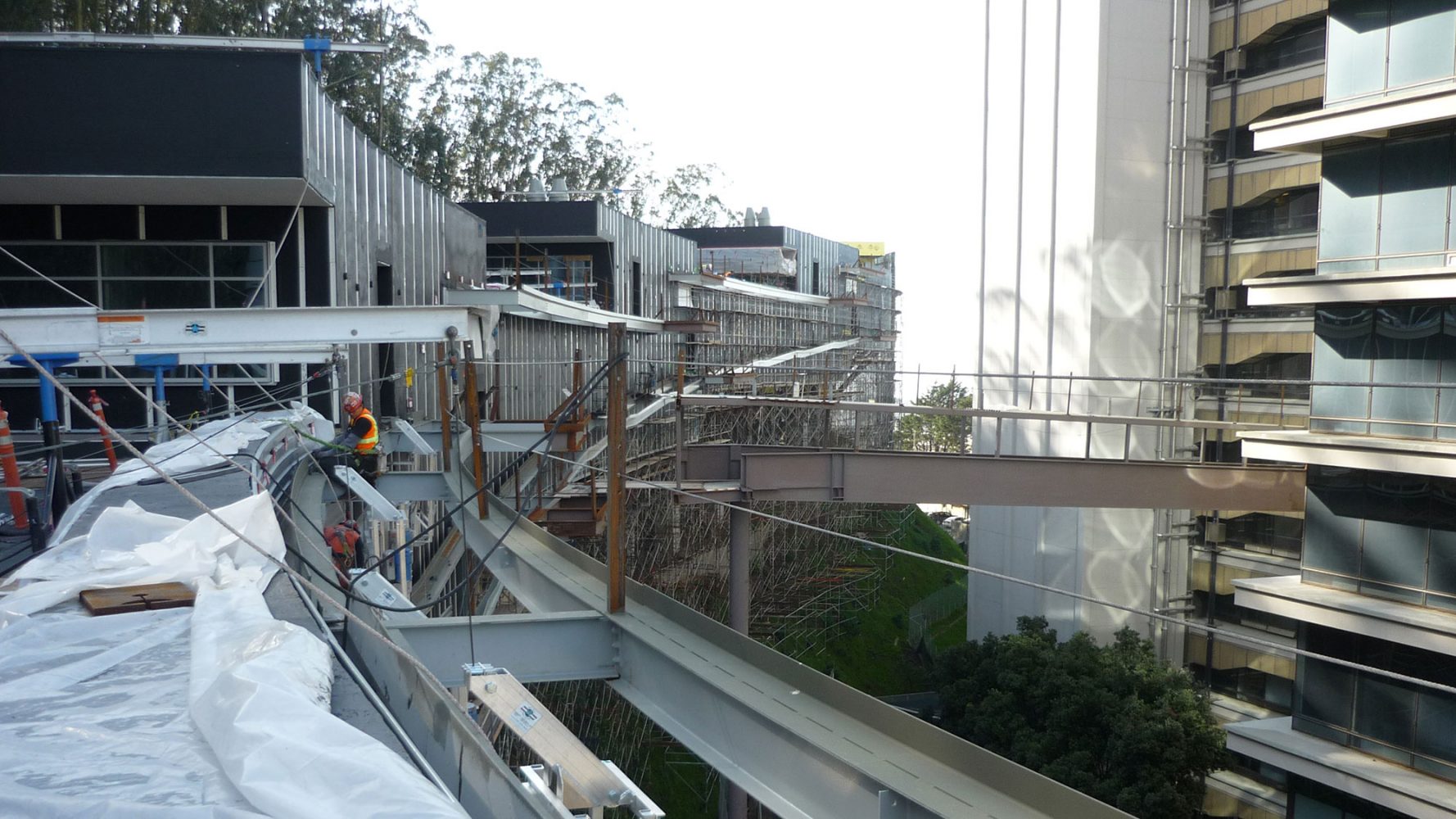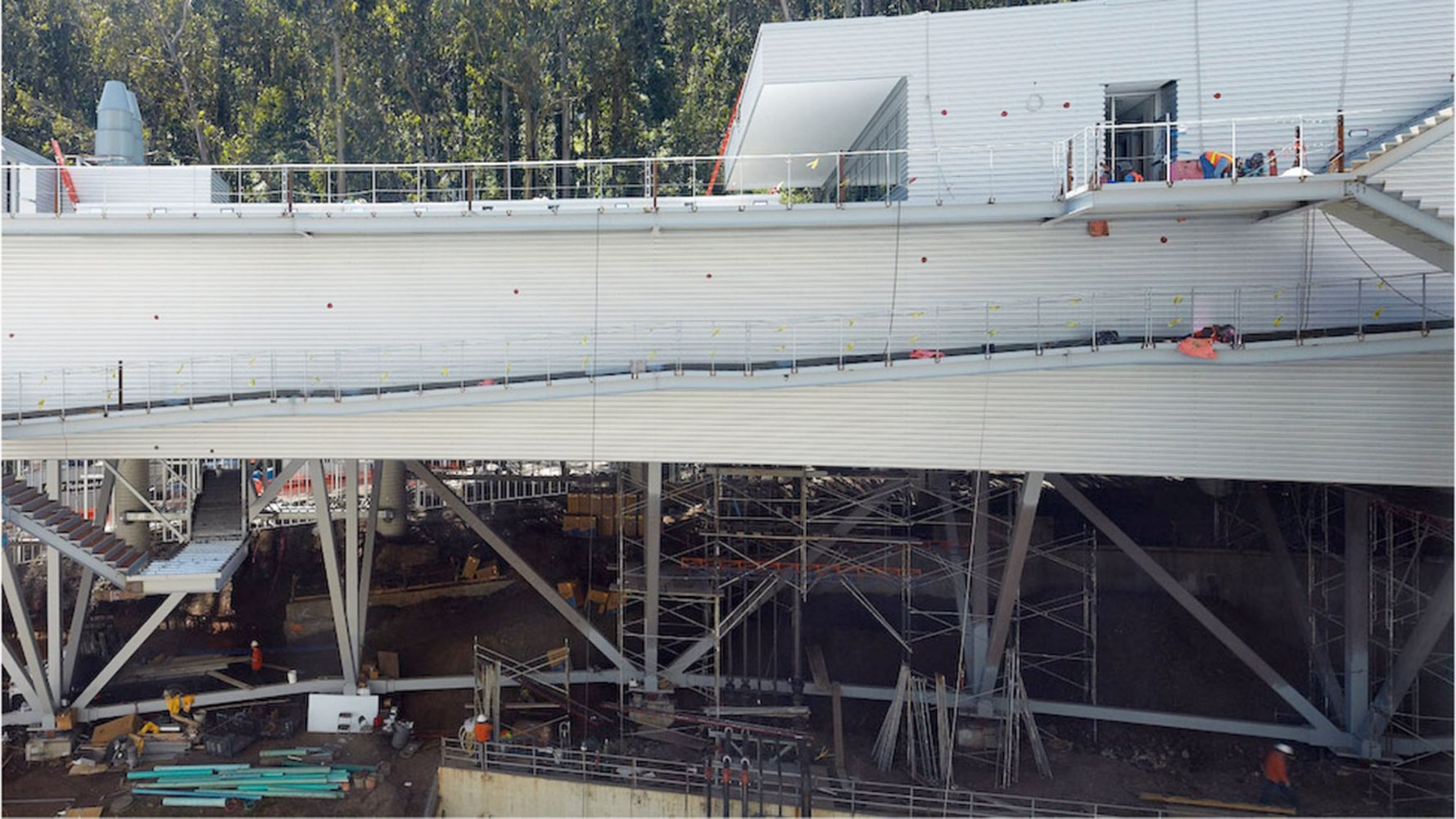 Given that the building was to be located on a steeply sloped site at the foot of Mount Sutro, the client expected a vertically organized structure, which could have led to the creation of a series of small, stacked floor plates that might not have been well-suited to the institute’s research needs. Based on the firm’s experienced precedent that a horizontal scheme is best for interior lab organization and for research collaboration, Rafael Viñoly Architects found a way to plan a horizontal building despite the challenging site. Four split-level floor plates step down a half-story as the building descends the forested mountain slope, allowing the main floor to function as one continuous laboratory. Each half-story step is topped by an office cluster and a green roof. Exterior ramps and stairs take advantage of the temperate climate to provide continuous circulation between all levels. The facility connects to three nearby research and medical buildings–Medical Sciences, Health Sciences West, and Health Sciences East–via a pedestrian bridge. The building structure is supported by space trusses on concrete piers, minimizing site excavation and allowing for the incorporation of seismic base isolation to absorb earthquake forces.