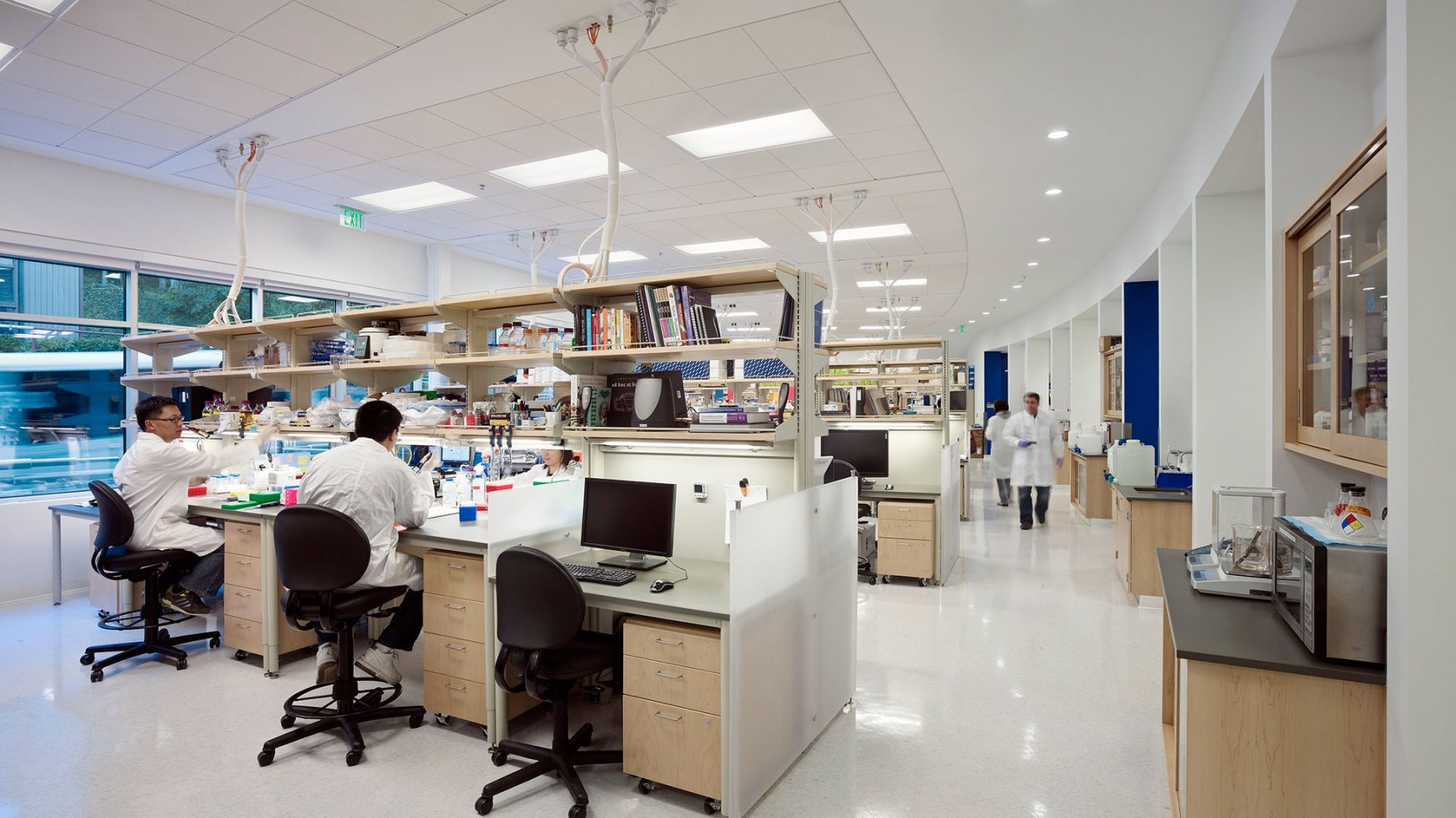 Inside the building, the transitions between the split levels are designed as hubs of activity. Break rooms and stairs located at these interfaces increase the potential for chance interaction, and interior glazing maximizes visual connectivity between the lower labs and the upper offices. To further promote collaboration, the laboratories occupy a horizontal open-floor plan, with a flexible, custom-designed casework system that enables the rapid reconfiguration of the research program. Abundant south-facing glazing fills the open laboratories and offices with natural light and views of the wooded slope of Mount Sutro nearby.
