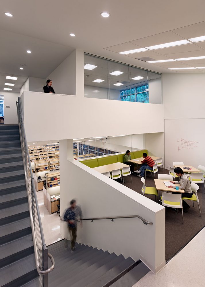 Rafael Viñoly Architects defined a long, narrow site on a steeply sloped section of the densely packed campus, where a horizontal building with four split-level floor plates that step down a half-story, allow the main floor to function as one continuous laboratory.