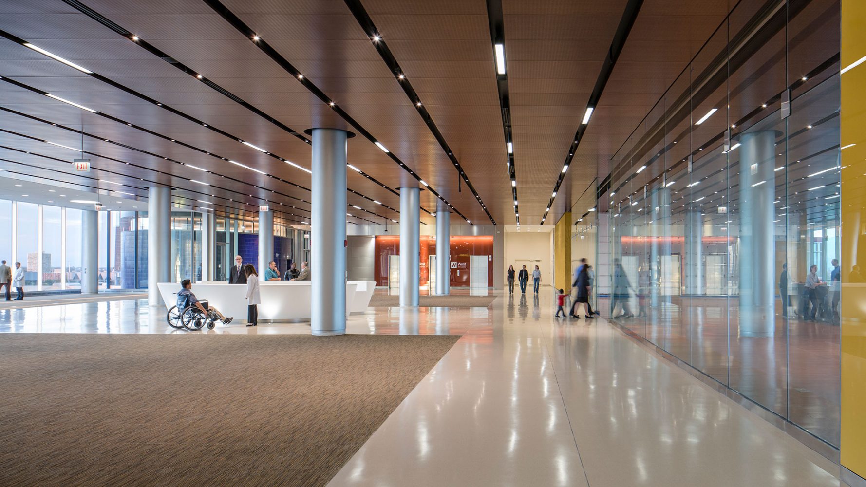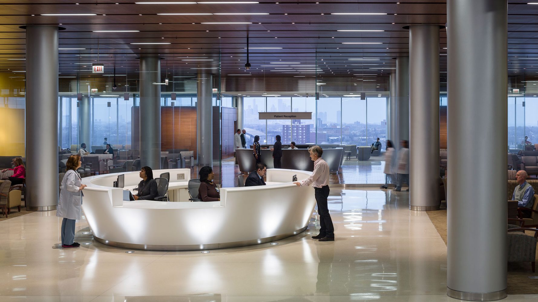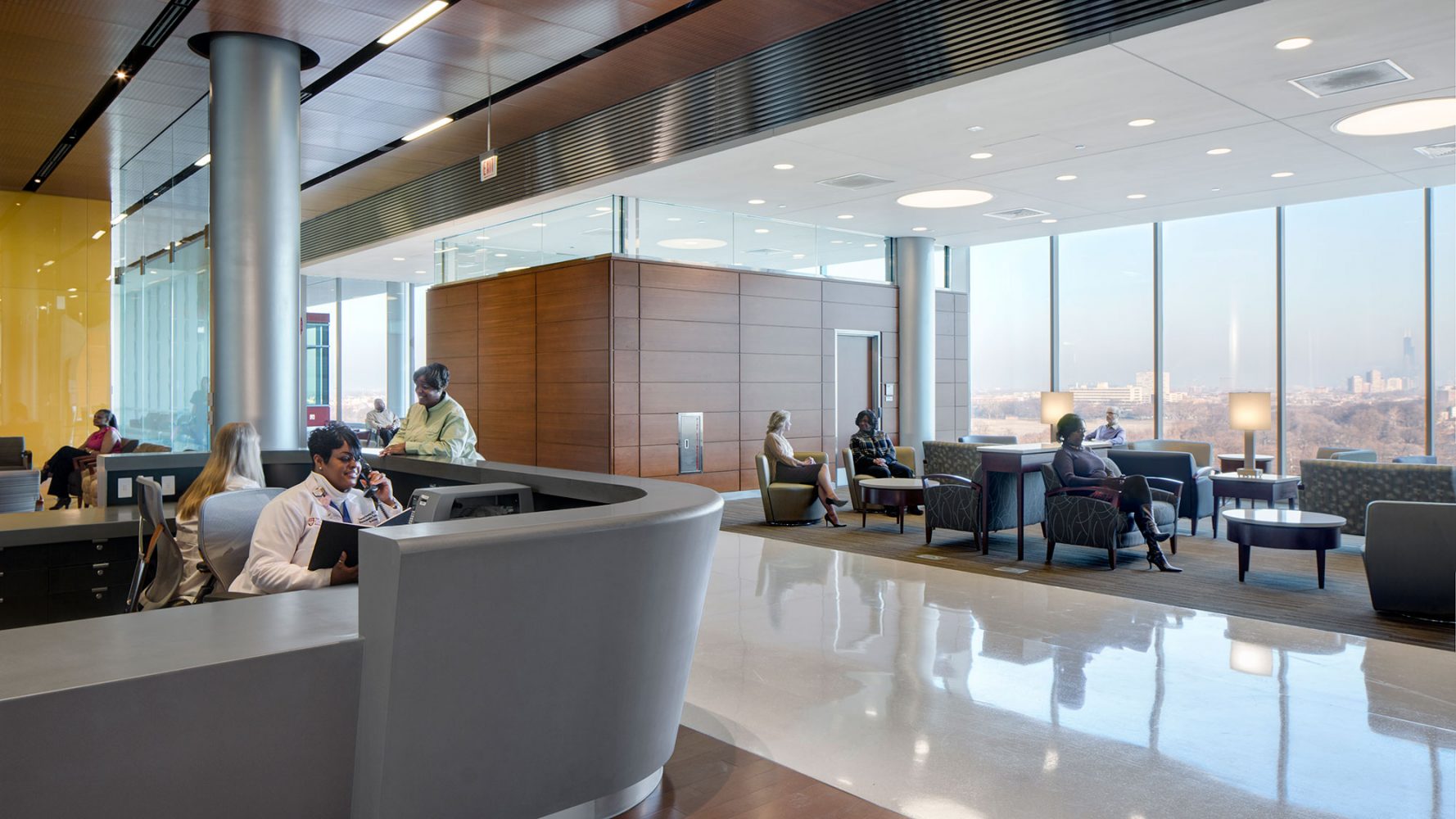 The Sky Lobby on the seventh floor houses central reception and generous waiting areas, family waiting areas, a chapel, a business center, cafeteria, conference center, and other public spaces. As the heart of the hospital, this Sky Lobby effectively lifts the social, contemplative, outdoor space of a traditional campus quadrangle into the air and provides visitors with expansive views of the university, Washington Park, Lake Michigan, and the downtown Chicago skyline. Architecturally, the Sky Lobby also provides a visual break in the vertical mass of the building, as the interior spaces on this level are recessed from the main exterior enclosure in patient units above and procedure rooms below.