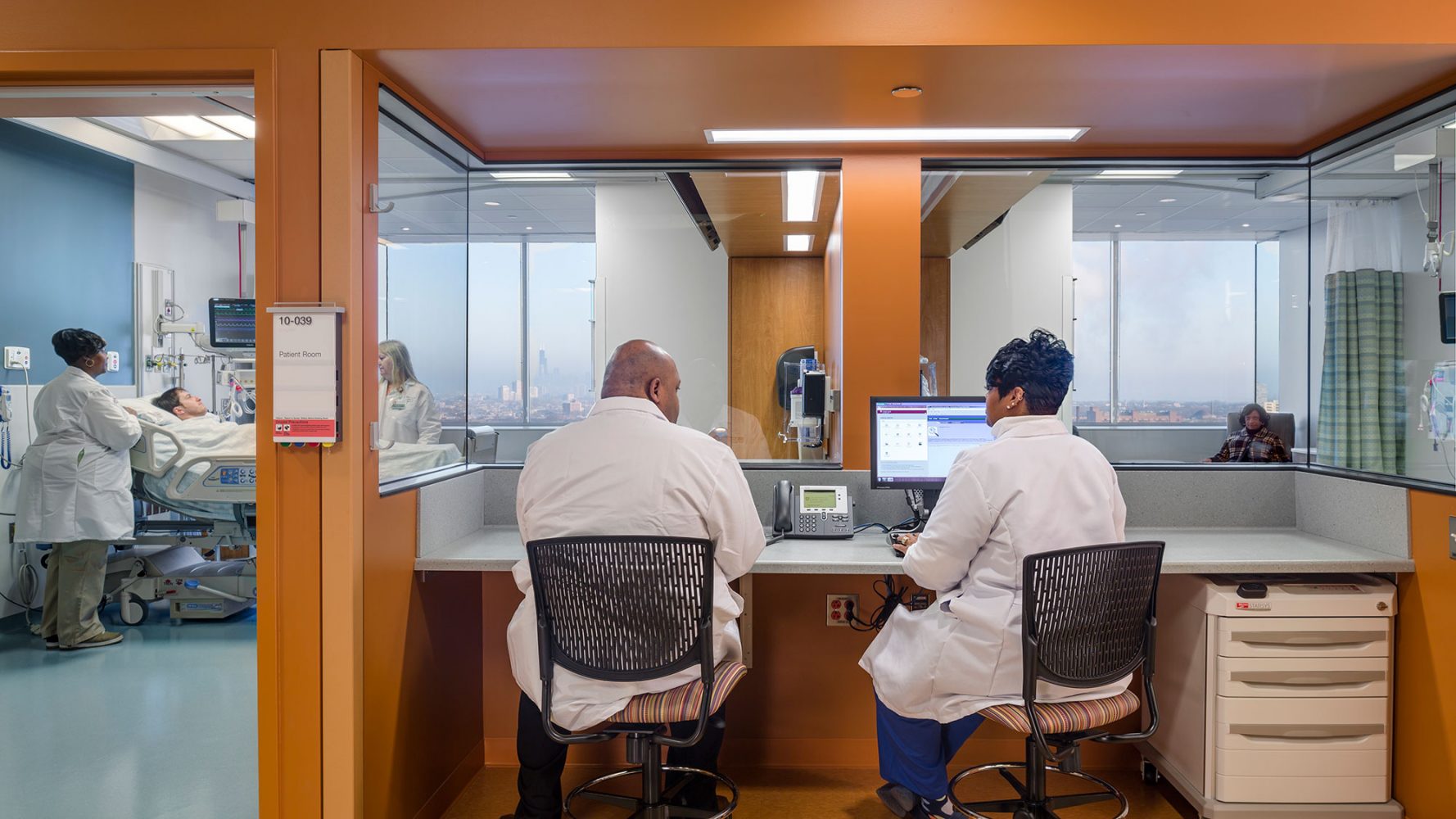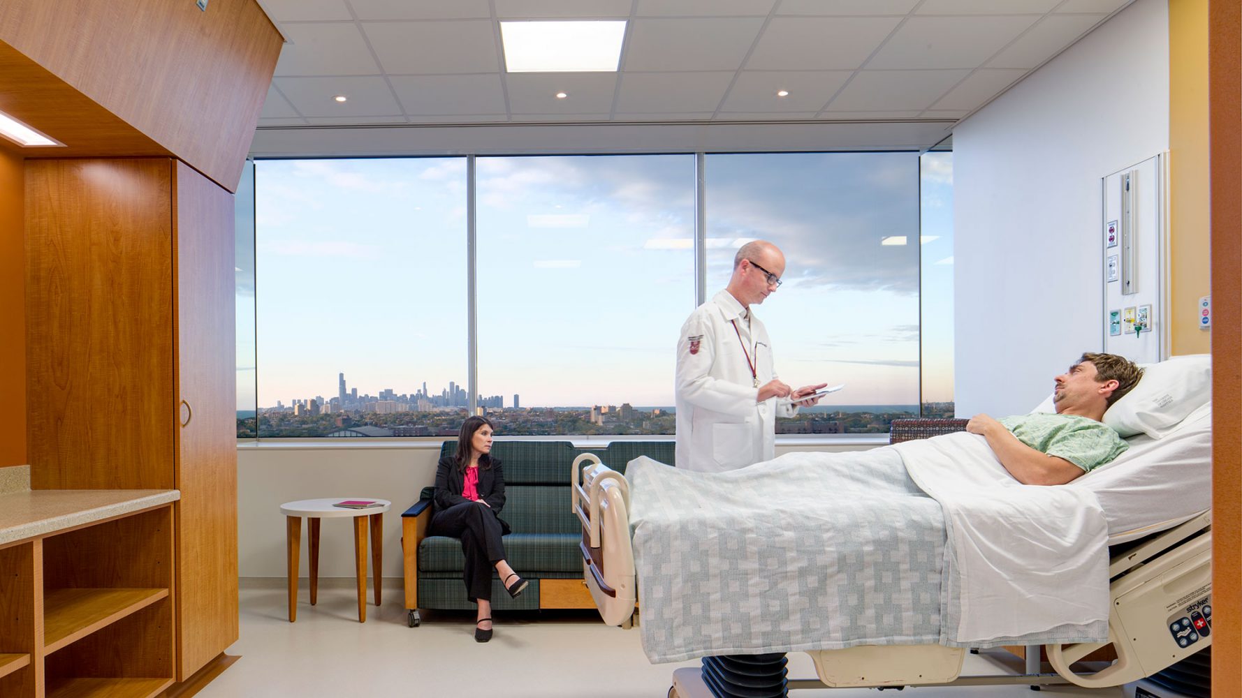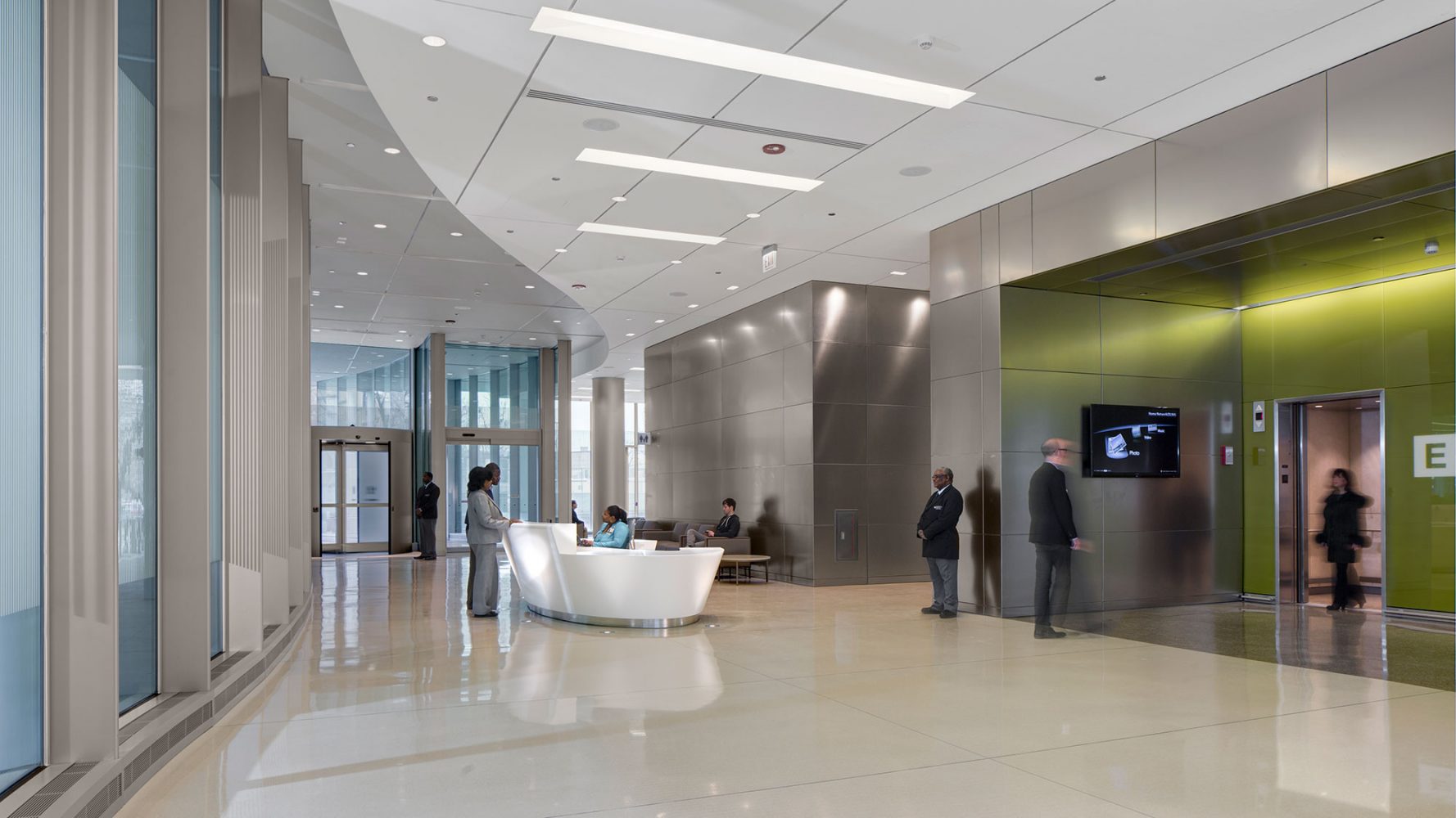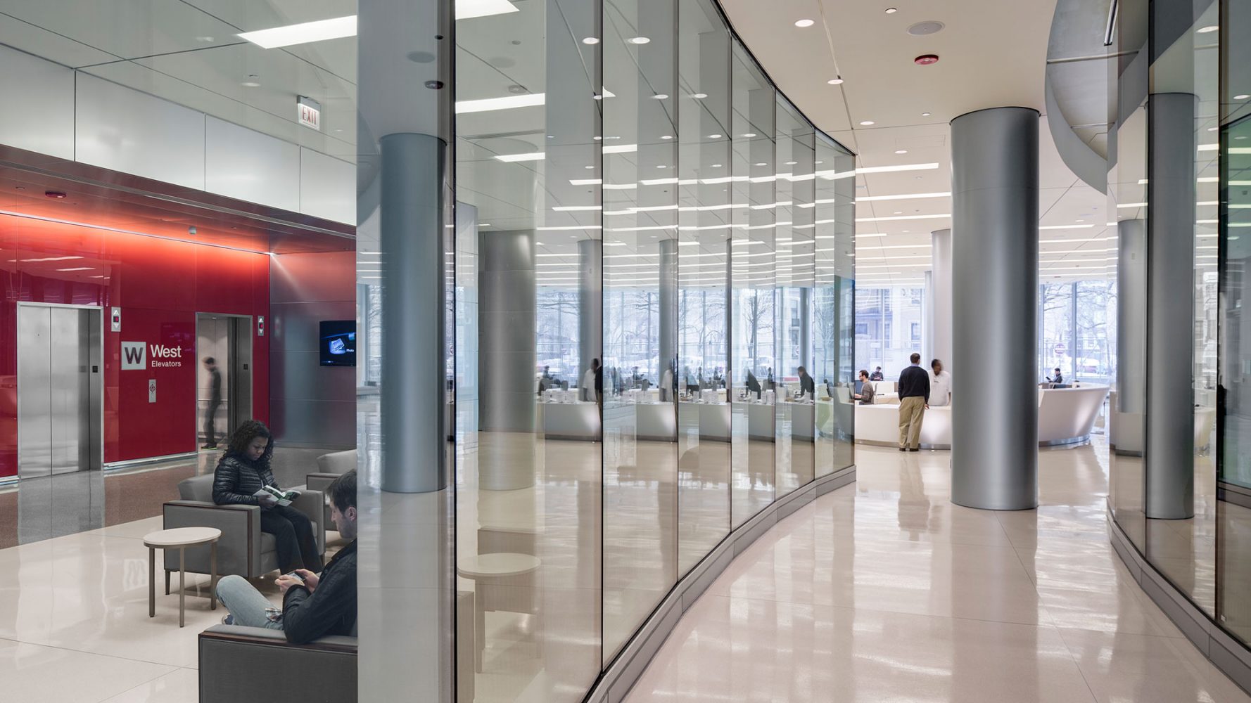 The Sky Lobby on the seventh floor houses central reception and generous waiting areas, family waiting areas, a chapel, a business center, cafeteria, conference center, and other public spaces. As the heart of the hospital, this Sky Lobby effectively lifts the social, contemplative, outdoor space of a traditional campus quadrangle into the air and provides visitors with expansive views of the university, Washington Park, Lake Michigan, and the downtown Chicago skyline. Architecturally, the Sky Lobby also provides a visual break in the vertical mass of the building, as the interior spaces on this level are recessed from the main exterior enclosure in patient units above and procedure rooms below.