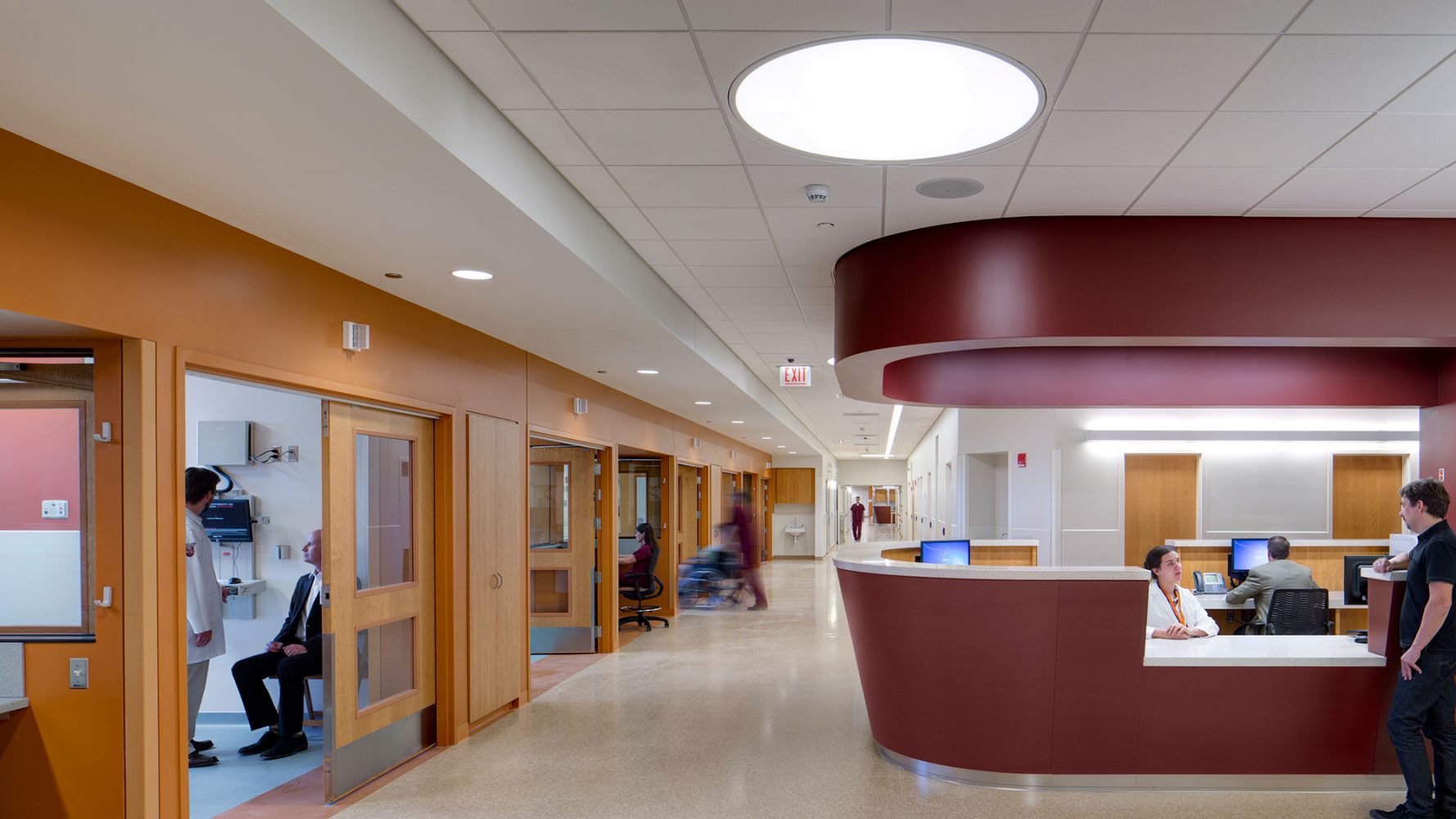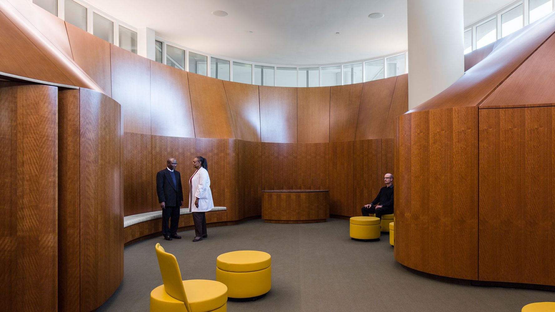 The patient-centered design is experienced on multiple levels throughout the Center. All 240 private patient rooms accommodate multiple family members comfortably. Each patient room has a sofa or recliner that converts to a sleeping space for one family member in addition to the patient. Achieving patient and family privacy was a design priority in the patient rooms, as was expanding the visual connectivity between patients and nursing. Shared waiting areas located close to patient rooms and nursing stations provide communal space for visitors on the patient floors and are accessible from the main elevators. The scale of shared visitor waiting areas was maintained as intimate.