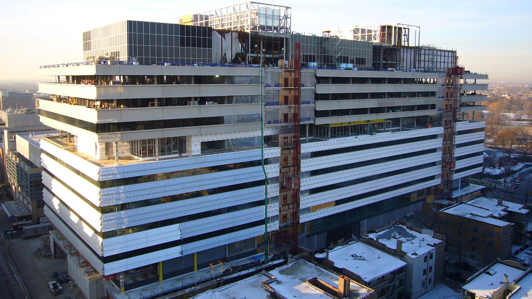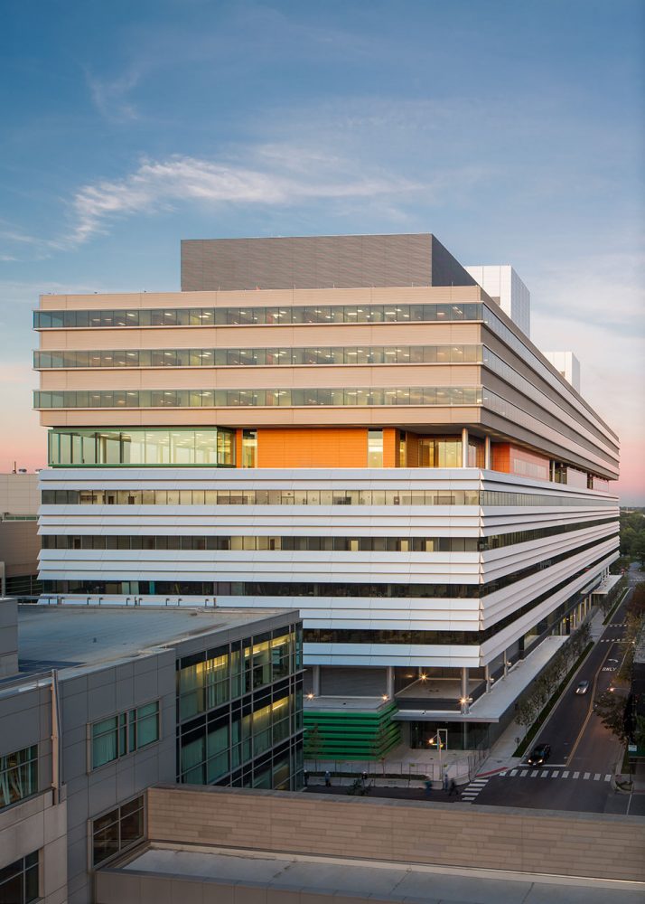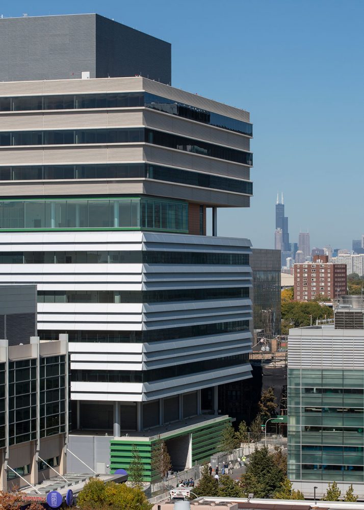 As an expansion to the University of Chicago Medicine, Center for Care and Discovery, this building occupies the given site and bridges across Maryland Avenue to an additional site to the west. Yielding large, undifferentiated floor plates that are inherently flexible for short- and long-term planning, this connection advances the hospital’s goal of maximum efficiency by allowing varying functions to be contiguous to one another and reducing the need for staff to travel between floors. The building was designed to accommodate continually changing medical technology and practices; in particular, the 5.5-meter (18-foot) floor-to-floor height and large 9.6-by-9.6-meter (31.5-by-31.5-foot) structural and planning module allows for enormous flexibility for reconfiguring departments and upgrading equipment.