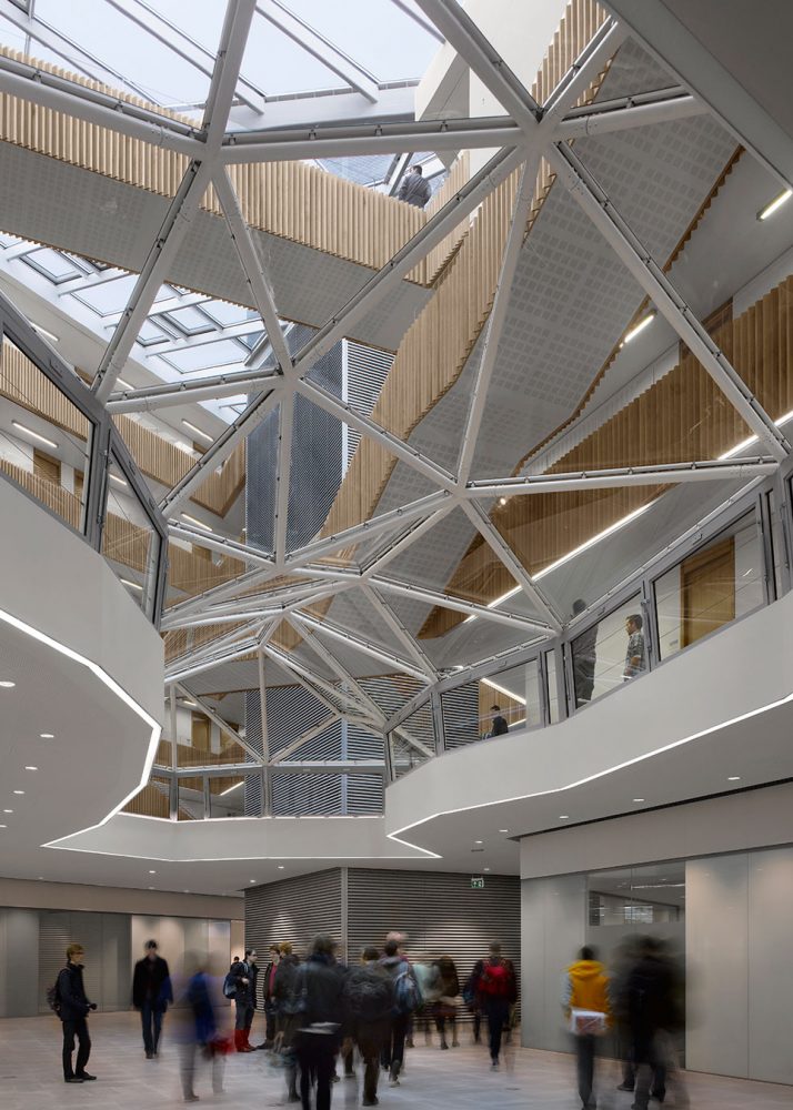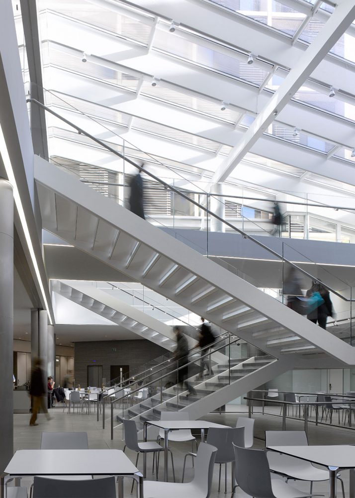 建筑内,教职员工办公室进行了隔音控制来保护个体的工作习惯。然而作为建筑的社交中心,中庭空间是一个设有天窗的充满阳光,宽敞的空间。被非正式集会空间穿透的中庭几乎延伸至整个建筑的长度,形成了视觉联系以及不同楼层员工间的即时会议,来鼓励协作。一系列的步行天桥和楼梯提供了必要的交通手段并激活了多楼层空间。