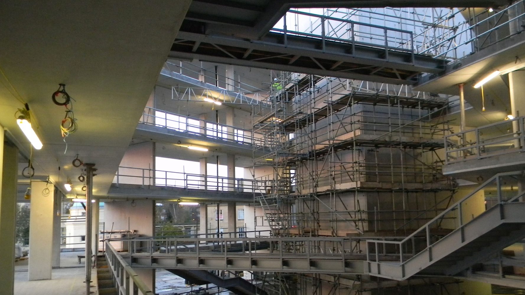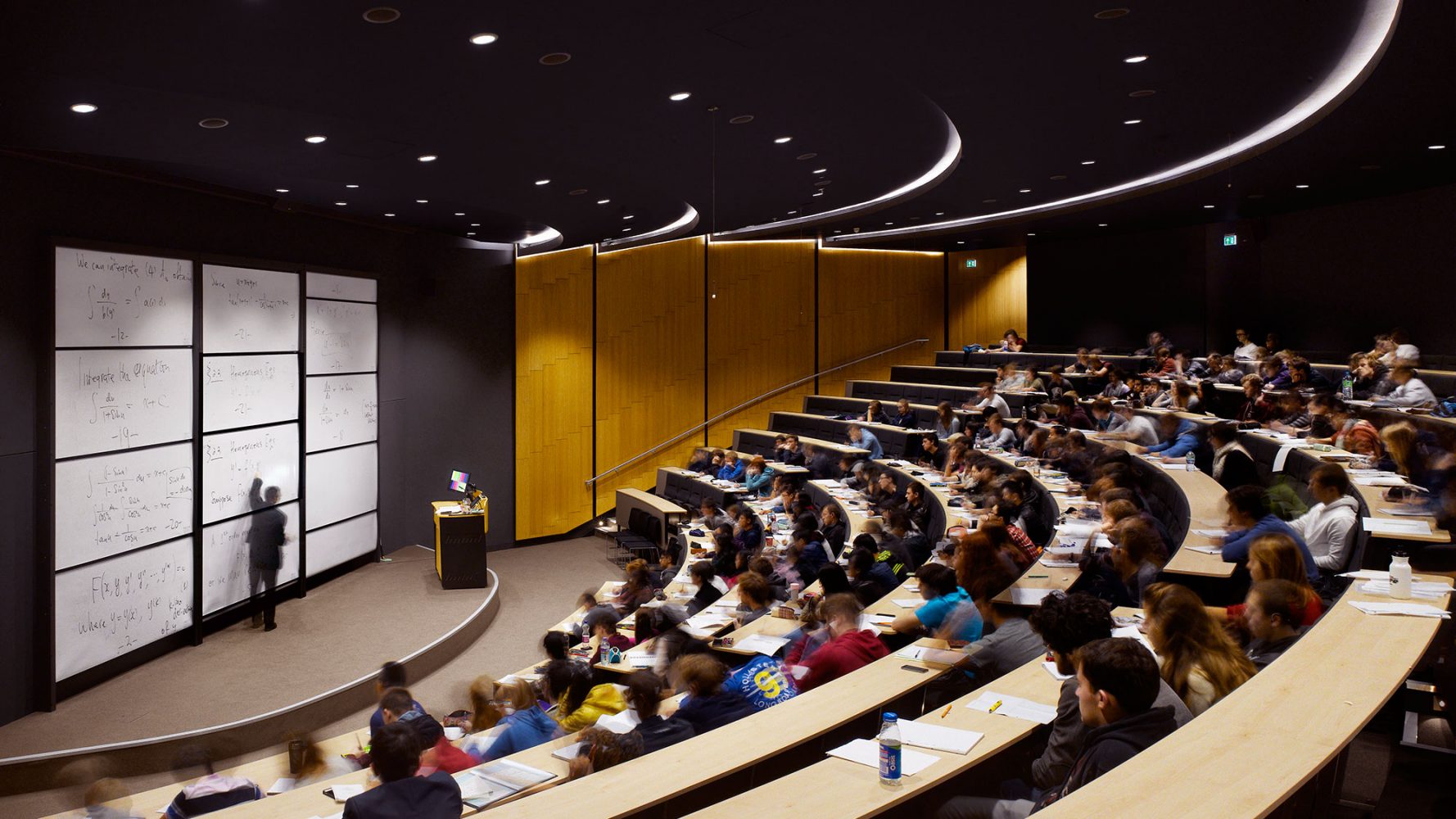 地下的夹层是一个集中的教学空间。演讲厅,教师和讲座室围绕一个用作非正式学习以及社交的巨大开敞空间布置。自然采光从中庭通过两个代表数学程式的水晶状进光孔结构进入此夹层空间。