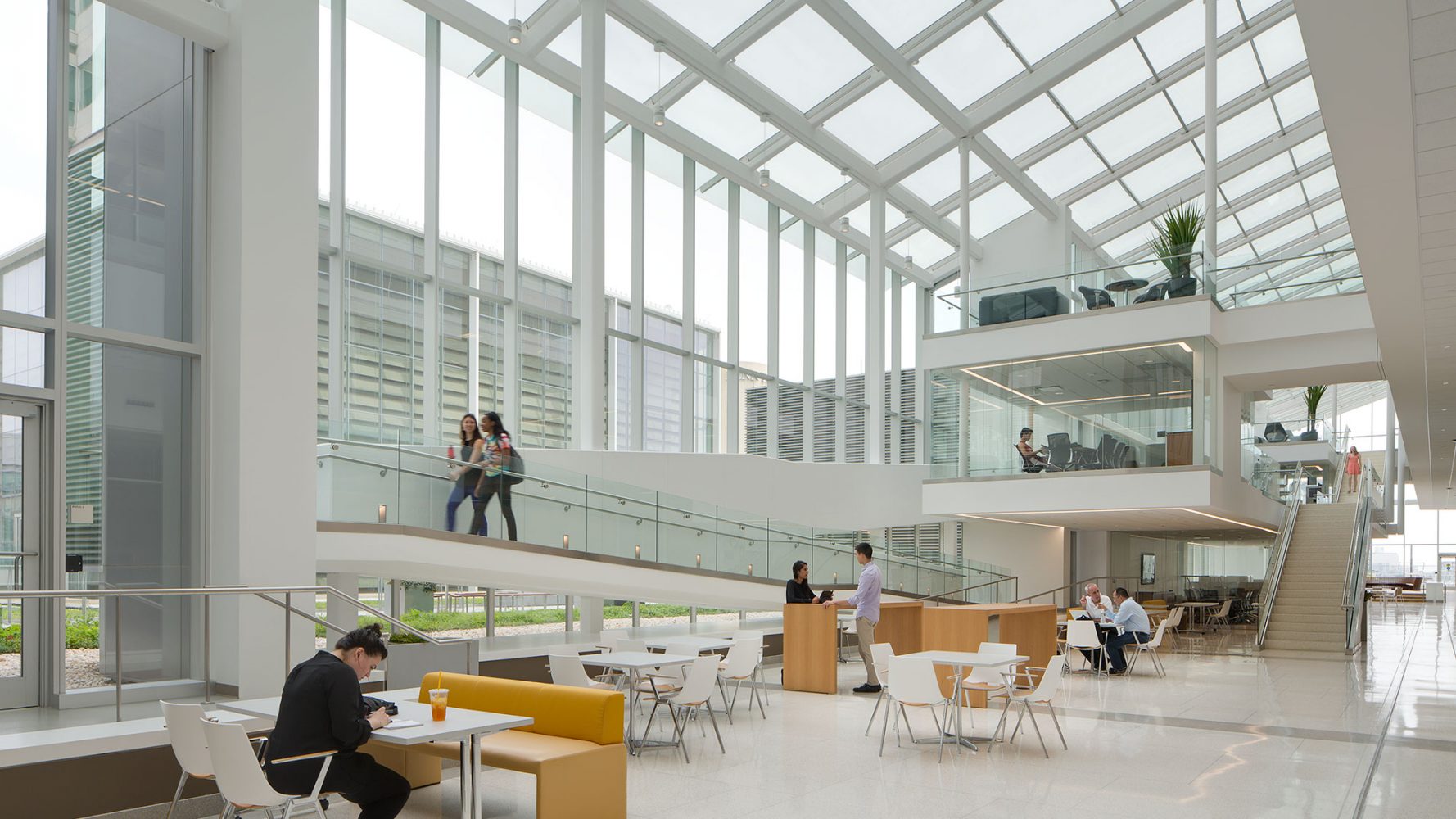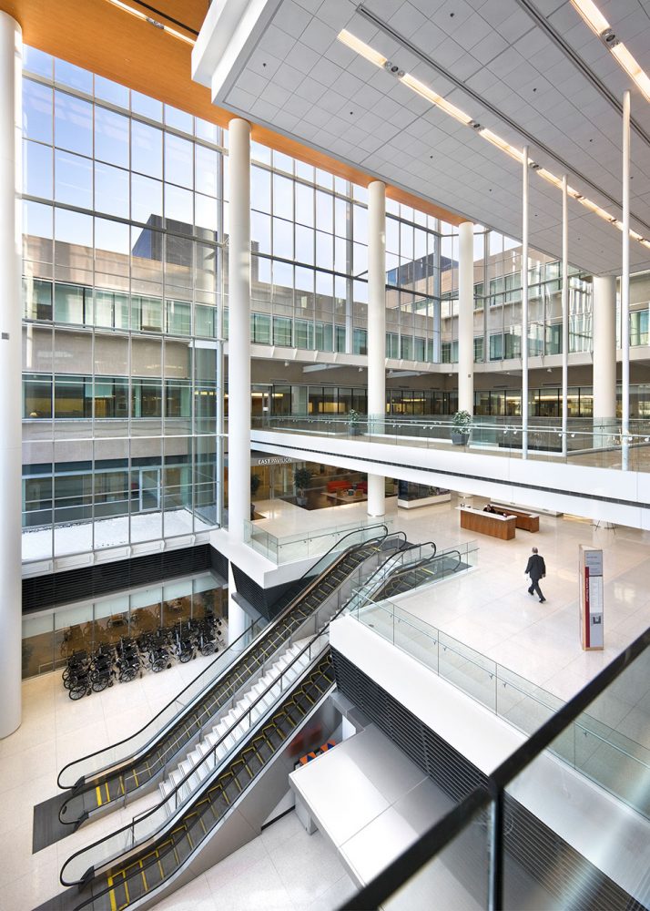 Un atrio lleno de luz organiza la circulación dentro de un complejo de instalaciones clínicas, educativas y de investigación traslacional, que prueban que es posible realizar un desarrollo por etapas en un mismo edificio sin interrumpir su funcionamiento esencial.
