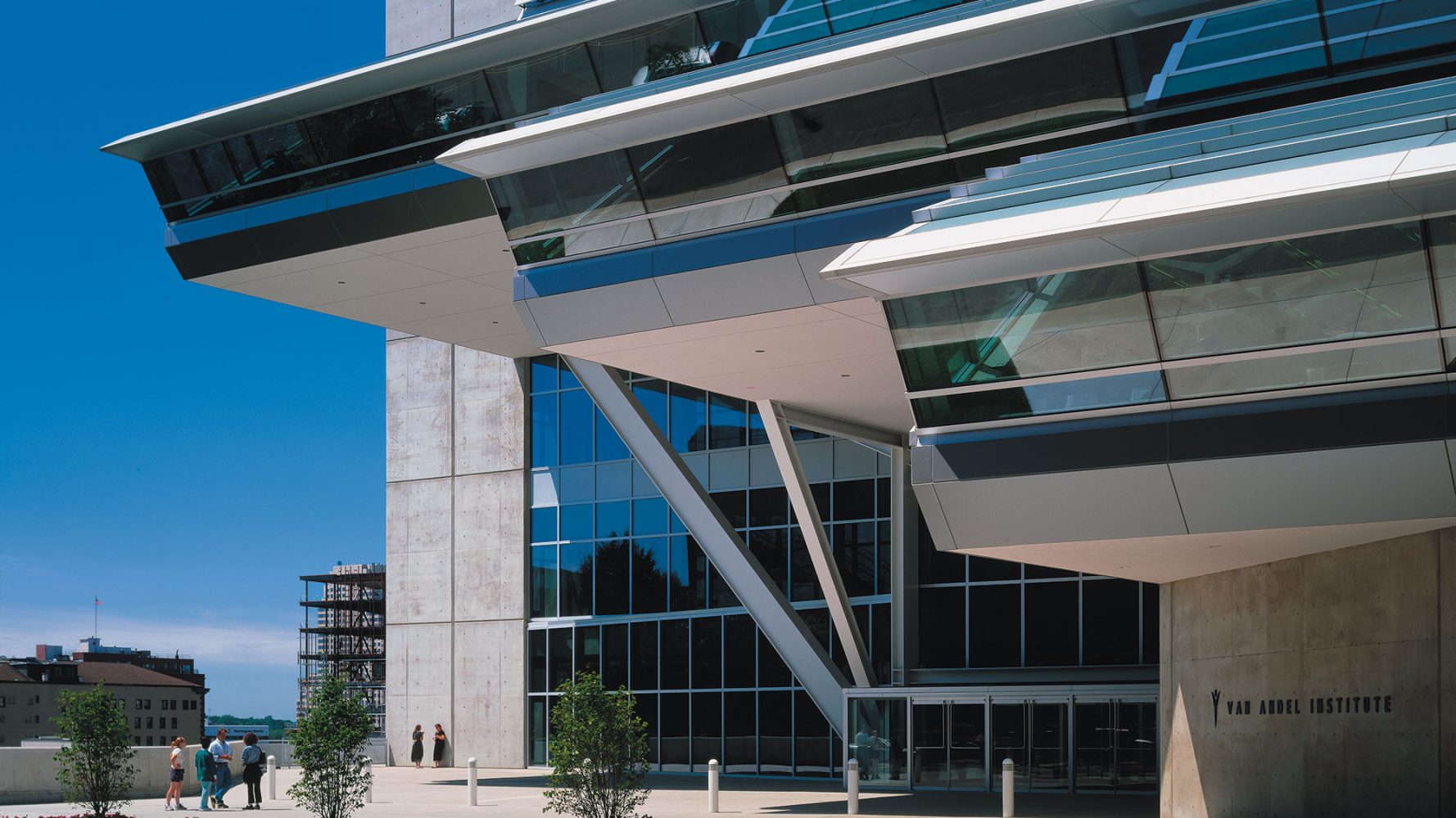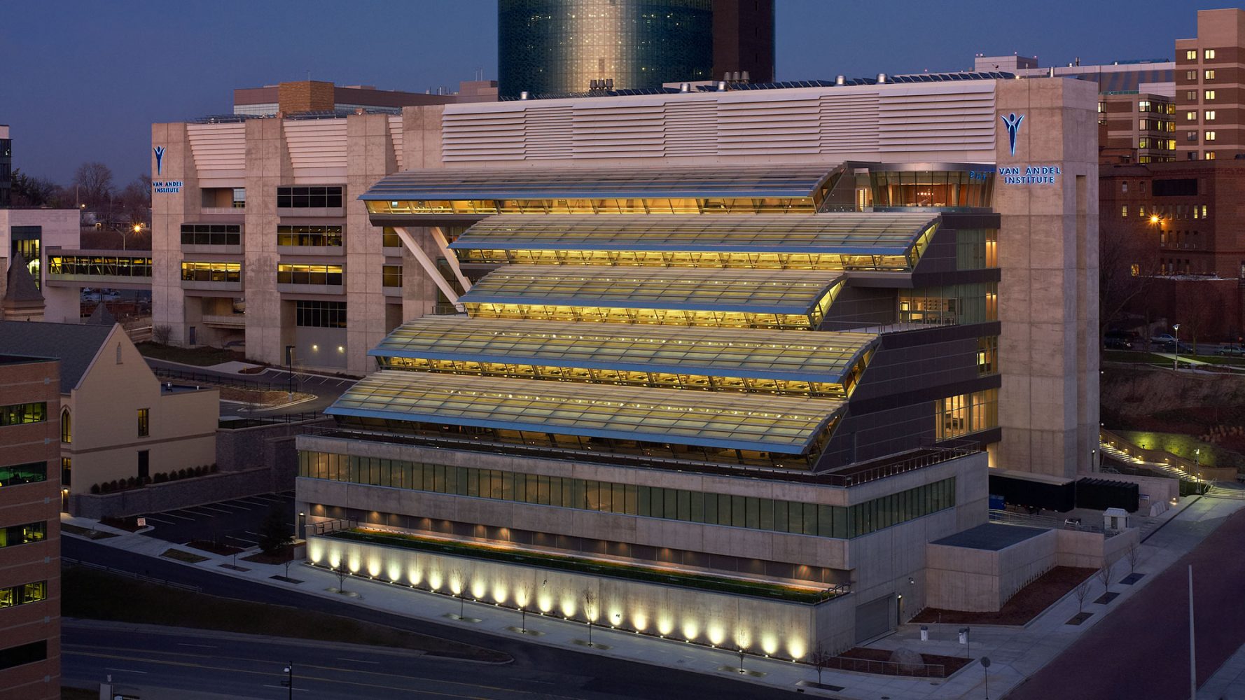 密西根格兰德河旁的Van Andel学院设有尖端的癌症研究机构,阳光穿过天窗落在退台式的楼板上,使人联想到了附近格兰德河的急流。为了回应这个不规则的形状和市中心的倾斜场地,维诺里设计了一个灵活的、可以随分期扩建的建筑,用以鼓励研究人员之间的互动和适应自1997年成立的私立学院研究功能的变化需求。