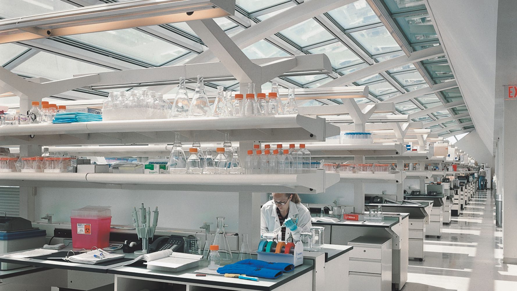 在倾斜的城市基地上两个退台体量分两期建设。灵活的实验室覆盖着烧结的拱形玻璃天窗使人联想到附近格兰德河的急流,并使得此项目成为最早期最大化的利用自然采光的实验中心之一。