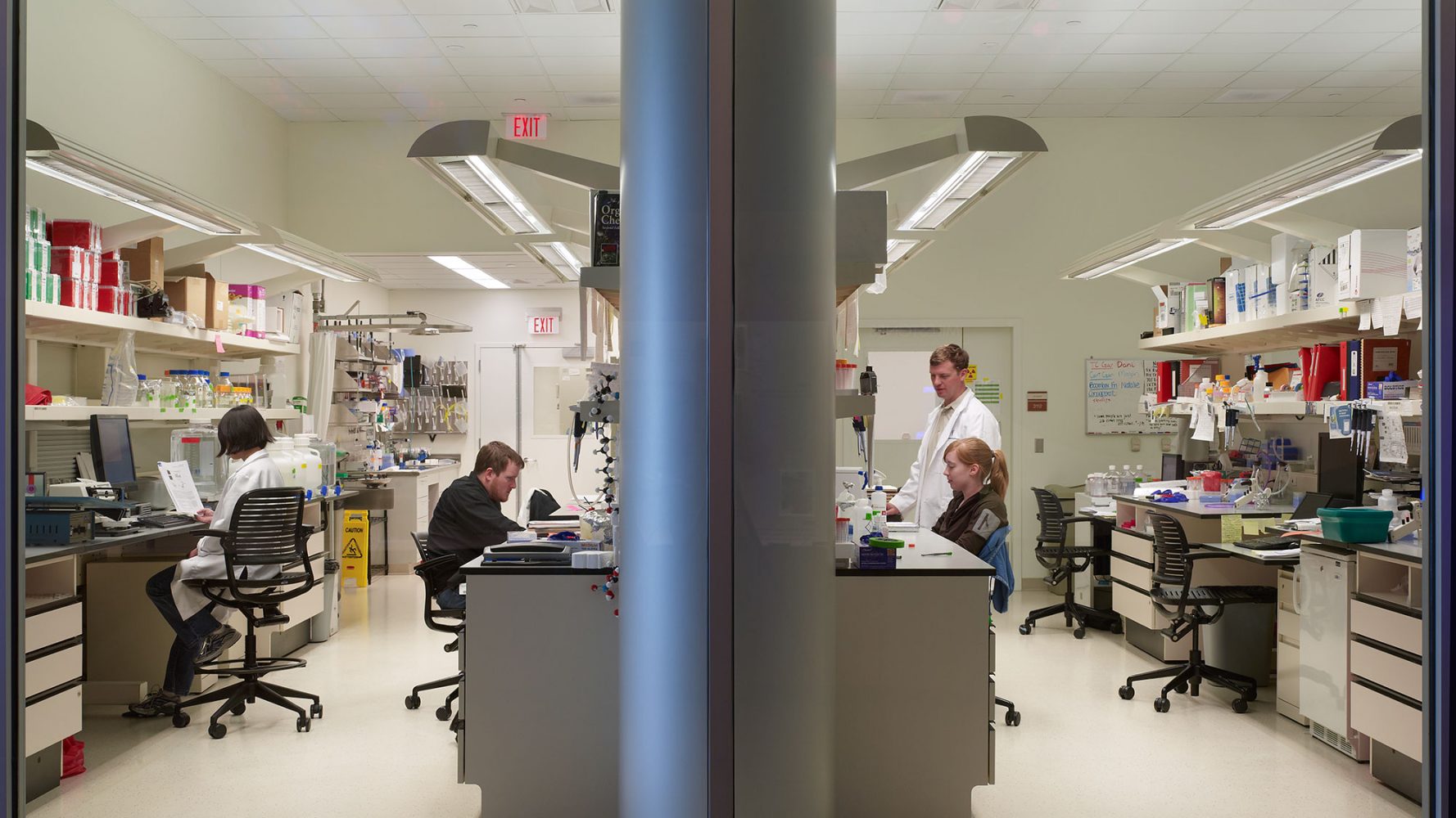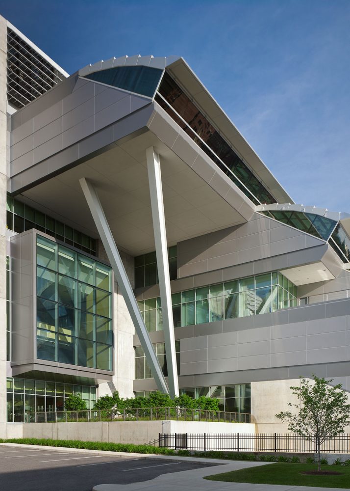 建筑的屋顶轮廓线由垂直的混凝土体量出现,布置有交通核心筒和服务功能。随着建筑第二期在2009年完成,这个垂直的核心筒已经成为建筑的中心。核心筒的东侧是设有实验室和行政空间的三层自然采光楼层,位于主入口广场之上,面向Bostwick街。核心筒的西侧,是五层沿山体下降的楼层,为研究员和工作人员提供远眺格兰德河市中心和格兰德急流的广阔视线。主入口位于三层,可以直接将人流引导至公共空间,到达会议室,活动室,咖啡厅和图书馆。建筑低层的部分是100停车位的停车场、装卸区、培养区和后勤空间。