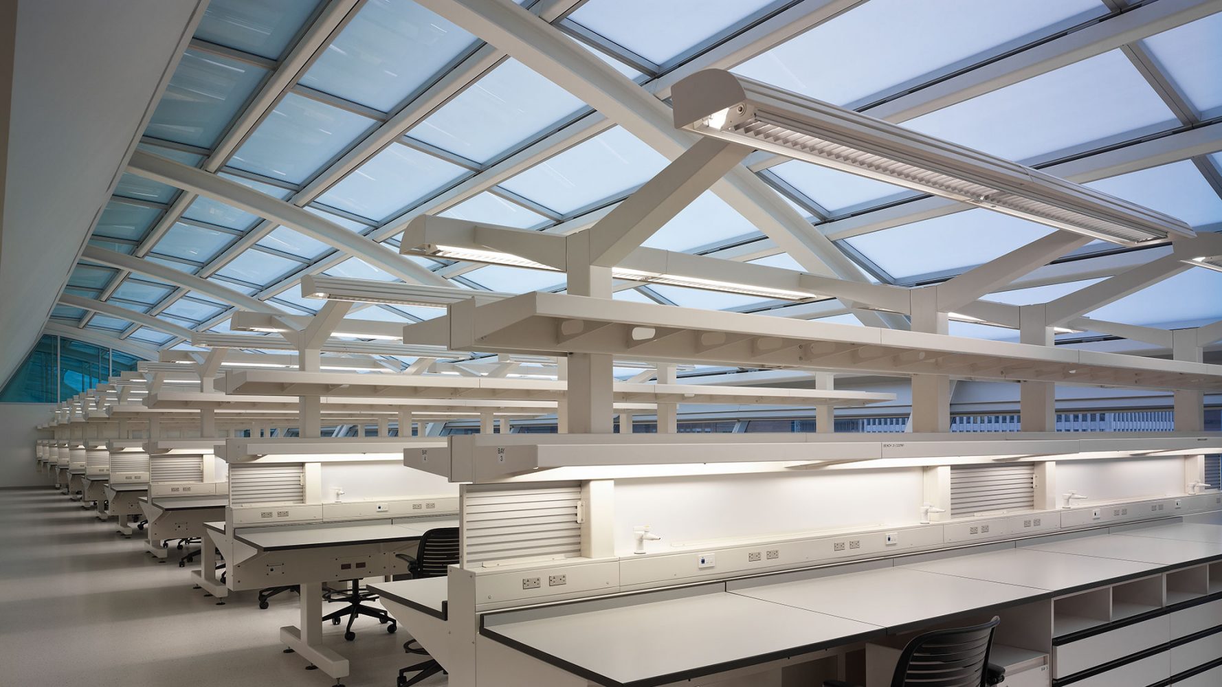 建筑的形状来源于楼板的退台,与两层通高的室内中庭和陡峭倾斜的地形所呼应。建筑锯齿状的弧形天窗由烧结和半透明玻璃组成,这样的设计允许自然光进入之下的研究实验室,这个设计在同类建筑中是比较特别的。建筑内面积最大也是最灵活的功能是研究空间,所有固定的设备和家具都设置在后勤区附近。普通的固定实验室工作台被重新设计成为可移动的实验工作台,并带有整体的照明和一个电源/数据控制系统以及真空系统和特殊气体管道。公共流线鼓励研究人员之间的互动。黑暗的、对震动敏感的区域,如350座的礼堂和一个动物饲养室,均设置在建筑的低层,嵌入场地的山体中。
