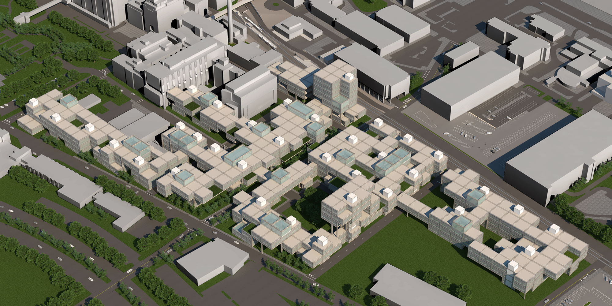 Representing the institution’s 2030 vision of future building development, the design integrates a flexible structural module designed to accommodate research, office, clinical or instructional space, deployed in modular building masses that create courtyards and terraces for shared community use. The plan preserves the campus’ predominant building height of 3-4 stories and creates a significant campus green around which future sites, currently empty or underutilized, can be developed. These low building heights not only respect adjacent residential communities but maximize pedestrian circulation and minimize reliance on elevators within buildings, thereby supporting interaction and collaboration among research community members.