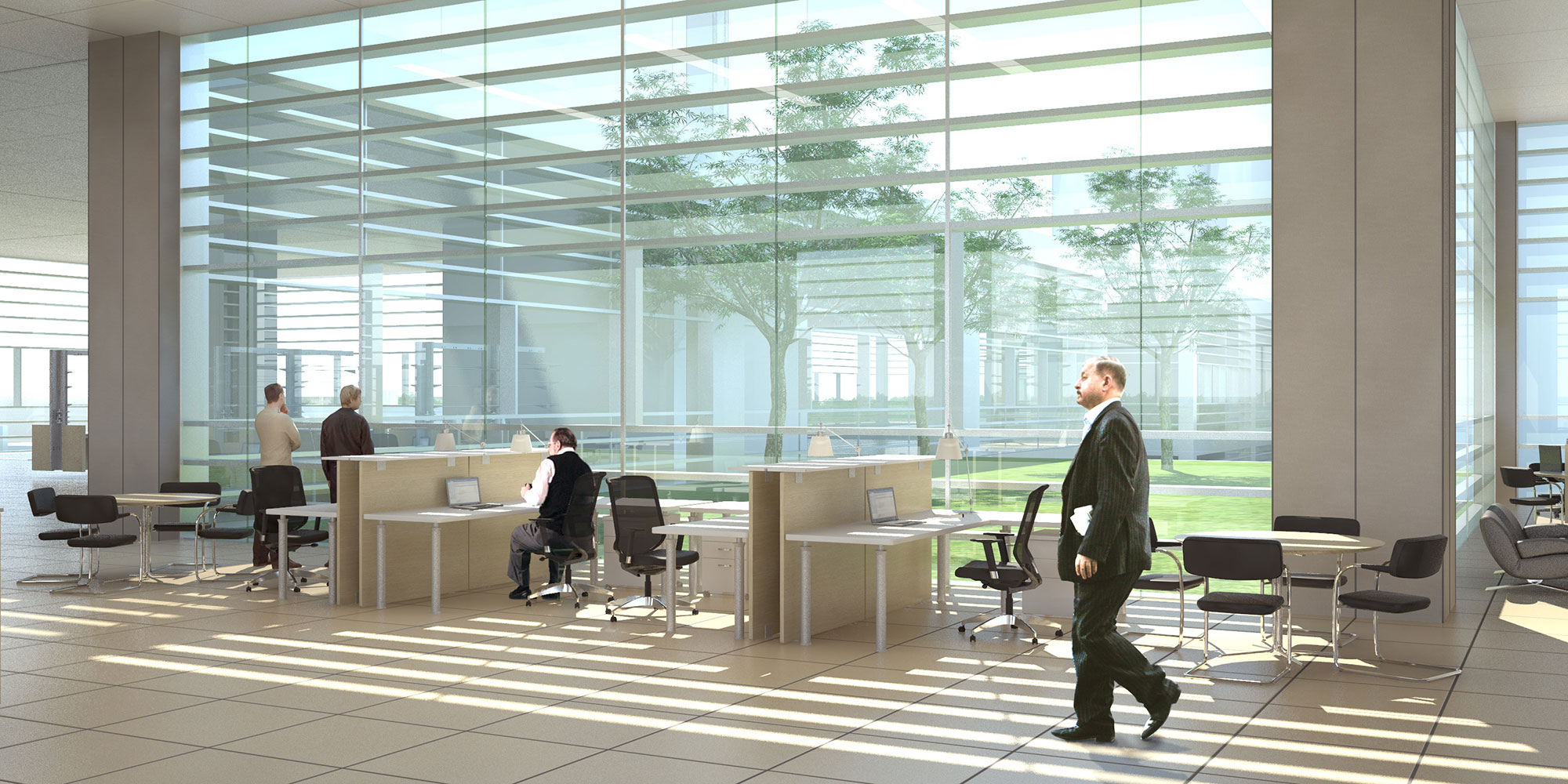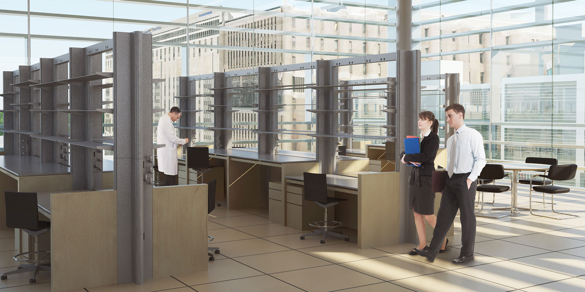 The building module, with a regular grid of integrated infrastructure and furniture, accommodates various research functions as well as common and support spaces.  Designed to be able to grow flexibly in the horizontal and vertical directions, this modular building block can aggregate in all four directions, creating contiguous spaces that accommodate a wide range of sizes of research programs. Within each future building, mezzanine floors can be added in the upper portions of the modules to accommodate office space, or they can be omitted at locations housing large pieces of equipment.